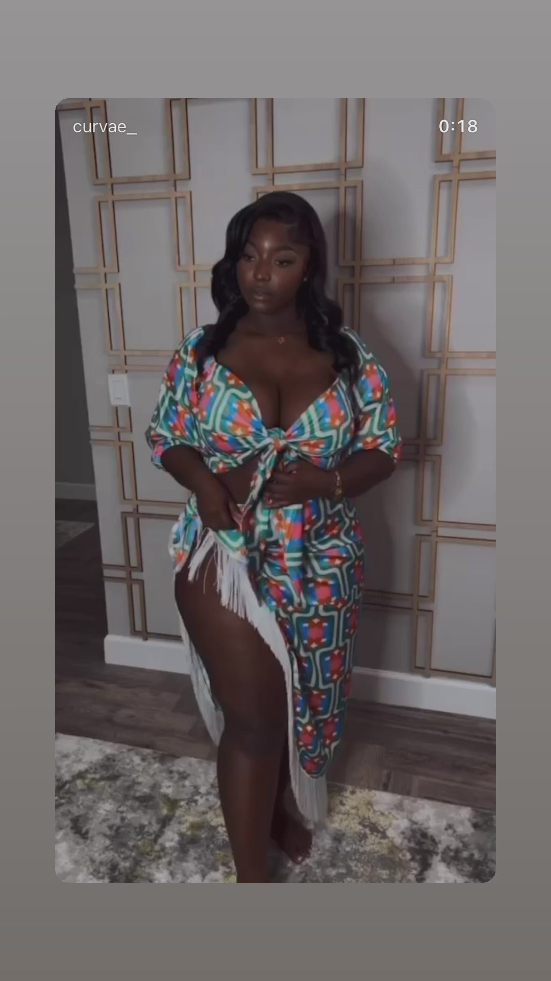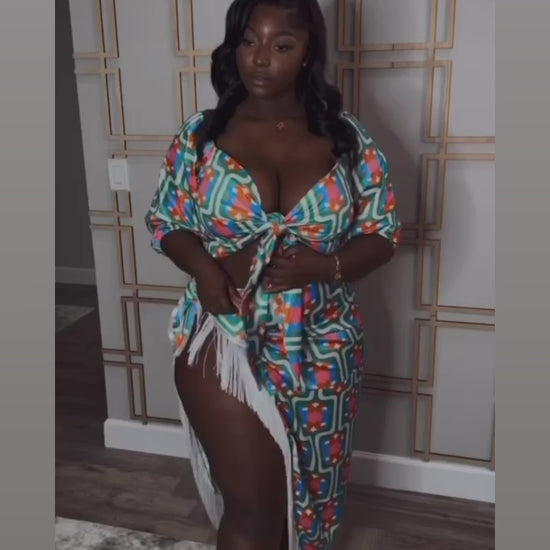 The Terri Set is a coordinated two-piece ensemble featuring a tie-front crop top with puff sleeves and a high-waisted skirt designed to hug curves. The skirt incorporates a thigh-high slit with fringe trim and uses stretch fabric for enhanced comfort. This set is suitable for various events, including vacations and special occasions.